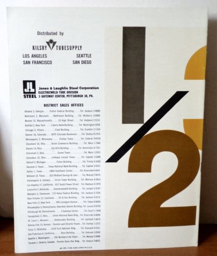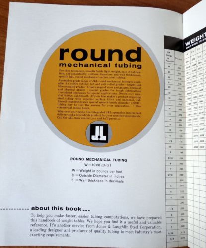 | Seller Notes | “Very Good. 1960. Jones and Laughlin., 8 oz. (Stapled Paperback/Pamphlet) Very Good Condition. light edge/cover wear. Same Or Next Day Shipping! Author: Jones and Laughlin, Publisher: Jones and Laughlin, Edition: 1960 Printing, Size: 11x8.5x0.25 inch, Subject: Steel, Metal, Industrial, Technology Engineering, Catalog, Title: Weight Tables For Welded Steel Tubing - Catalog” |