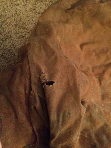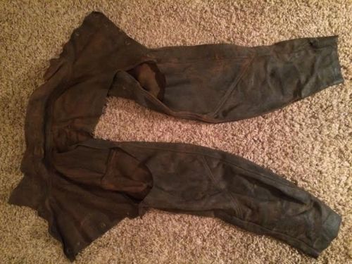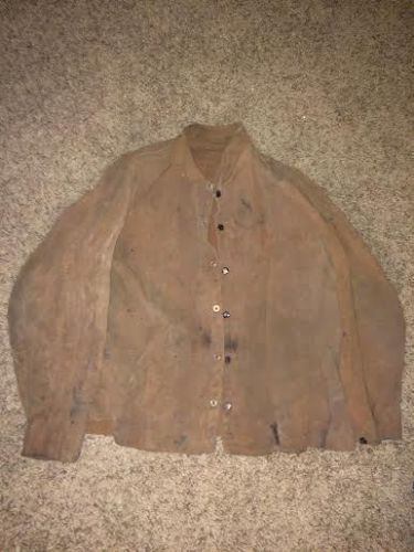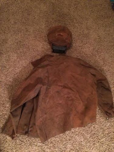 | “Vintage welding outfit. Size SM-MED. A hole in the back near the collar. Nice outfit. No Brand shown on the clothing. Vents at the top of the hood. Visor flips up and down. Head size has a knob to adjust to fit inside the hood.” |