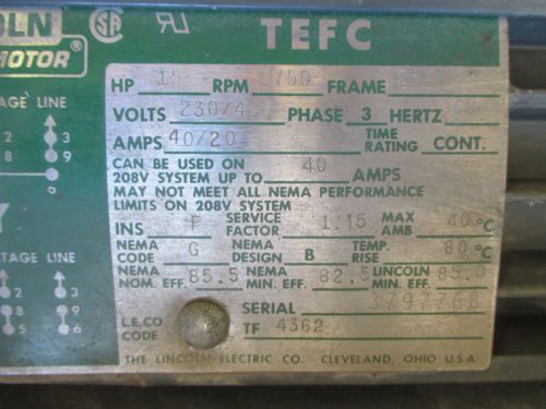Lincoln 10Hp TEFC A/C Motor 1170Rpm 3 PH 230/460V FR: 256T