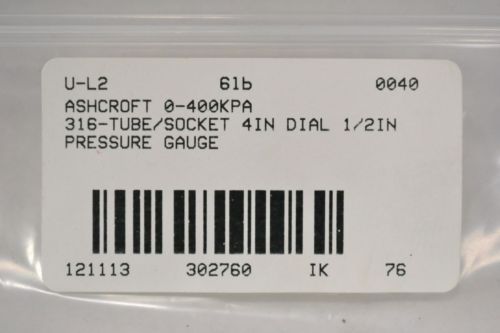 LOT 4 ASHCROFT 0-400KPA 316-TUBE/SOCKET 5IN DIAL 1/2IN PRESSURE GAUGE B302763