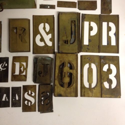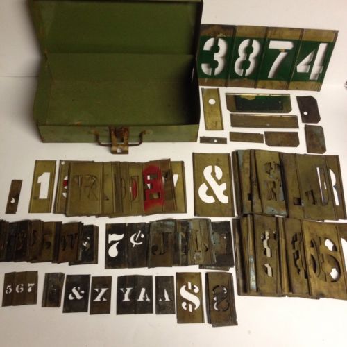 VTG BRASS LETTER STENCILS STE OF 45 WITH ORIGINAL WOODEN BOX/BRUSH