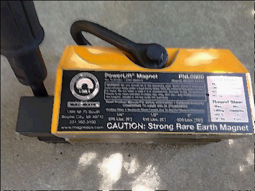 Used PowerLine magnet pnl0800 Has scratches and dents Magnet weight 22 lbs Flat plate max lifting 800 lbs, min. thickness 1 inch Round steel max lifting 400 lbs, min diameter 3 inches