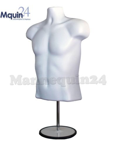 White Torso Male Countertop Mannequin Form (Waist Long) W/ Base For S-M Sizes