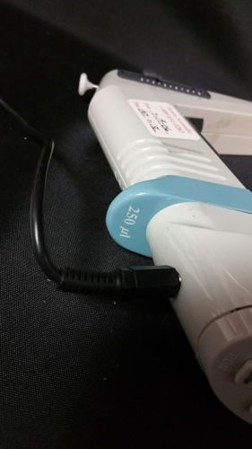 | “Only turns on with power supply. Does not hold charge, needs battery. In good condition. Some marks/stickers from use. Actual item pictured, comes as is. Has been tested for adjusting, pipetting and ejecting. Has not been tested for accuracy and precision. Calibration unknown.” |
