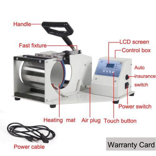Store Category Newsletter Add my Store to your Favourites and receive my email newsletters about new items and special promotions! Sign Up 60% off Details Digital Cup Mug Heat Transfer PressMachine Sublimation Coffee Latte Mug Printing Watch This Item Email a friend Click Below Images to Enlarge Description Introduction This is a digital mug heat press transfer machine could transfer colorful pictures and text of sublimating and dissolved printing ink onto ceramics, glasses and textiles.It provides a accurate temperature and heating time to your job. The new heat preservation function could not only increase safety, but also increase the service life of mug attachment. This is our higher end model commercial duty mug press. It can do 100's of mugs per day. It is stronger, heavier, better electronic, better heat mat than our low end model. There is a blue or white control box for this press, we will ship you which ever we have in stock. Technical Parameters Voltage 110V Power 350W Temp range 0-430 Fahrenheit Mug attachments 3.1" - 3.9" diameter (9" L x 4.5" H) Corresponding transfer area 3" x 8" Weight 6.8KG Package 38X38X33CM Machine color White Timer Control Adjustable from 0 – 999 seconds Feature Brand new in box Constructed with steel frame Dual display digital gauge: Timer and temperature. Auto temperature stablization: Adjustable temperature setting. Auto timer/alarm count down: Adjustable timer setting. High Quality Mug Wrap: It can fit 11 oz. and 15 oz. standard mug. 110 V, standard wall plug. Easy to operate,small volume Use digital microprocessor control programme, parameter memory, exact precision, touch control panel Automatic digital timer Very safety packing Lifetime services available on machine Floating mug press clamp. All mugs are not exactly straight walled. It has a 1 to 3 degrees tapper (so they can be pull out from the mold). This mug clamping feature has a floating bar. It will automatically distribute the pressure evenly across the face of the mug. How to use Please download here ENGLISH MANUAL HERE to see how to use Take a digital photo Print it out on sublimation paper with sublimation ink in your printer Cut the paper image to about 3" x 8" size Wrap the image facing in the sublimation coated mug Place the mug in the mug press cup holder Set temperature to 200 C Set the desired time (varies from 45 sec. to 2 minutes. Longer time leads to darker impression) Take the mug out when timer buzz Your customized mug is done! Attention: Press the correaponding temperature and timing for the object that is going to be shaped, put into the object, close up the pressure handle, press the executive key, the temperature will straight to achieves the higheat heating temperature, wait for few times(set), you will hear a hint sound, the pressing is finished, pull up the pressure handle, press the executive key. Do the next object or turn off the power. Package Includes 1 X Fully-assembled machine 1 X User manual FOR ALL OF OUR CLIENTS NOTICE: There are many new brand name of similar item in the market recently, although their price are really cheap, but the quality of their products are also terrible: 1. That factory only produce as a lower price as they can, they won't care about the quality.All our item is pass the ISO9001 quality certification 2. Have visit and purchase the item samples from some other supplier, many samples are in bad quality. After compare samples again and again from different supplier, finally we provide this top-quality item for you at lowest price. 3. You can purchase a high quality and safety machine, but please don't waste the money for a cheaper but a low quality machines. We only sell top-quality item. Base on the top-quality, then we will beat our price as lowest on eBay. 4. We keep a good relationship with the supplier, so that we can get the stable and reliable stock for our client. 5. We only sale the top-quality machine, we can provide the reasonable price since we have fight with the supplier as a lowest cost as we can. SHIP from USA,DUTY FREE DHL or FEDEX SERVICE with TRACKING NUMBER Shipping Payment Returns Warranty About Us Contact Us 1.All items will be dispatched within 24 hours. 2.We ship the item(s) by Fedex / UPS from our warehouses in CA, United States. 3.We only ship our products within United States and Canada. 4.It usually takes 3-7 business days for customers to receive the parcel depending on the destination. Approximately 5% of parcels delivered may take longer than the official estimated time due to customs clearance . Remote area destinations and Canada usually take 10-15 business days. 5.After your order is shipped, you will receive the tracking number and also the tracking number will be added to your eBay order for you to track. 6.If your product has not arrived within the estimated delivery time, please contact us. Once the parcel was confirmed as lost by the post office/couriers after 14 working days waiting, a new item will be sent out or we will refund you full money. 7.Most of our products are free postage,special circumstances will be listed clearly in the listing. 8.Please note that we cannot ship to a PO Box. We recommend that you leave us with your physical address. 1.We accept PayPal only. Credit card or e-Check via PayPal will be accepted. 2.Payment is needed within 7 days once you have purchased the products. 3.We give positive feedback immediately after payment is receivd. For customers who purchase items which enjoy 60 Days Money Back Policy, please kindly read the terms and conditions below before returning: 1.The period of 60 days is calculated from the date the item is dispatched. 2.The item must be returned in original resaleable condition with all tags and packaging (ready to be put back on the shelf). 3.DO NOT stick or write anything on the item itself or its packaging.Please only write or place postage stickers on the outer postage packaging. 4.It would be at the buyer’s own cost to return the unwan