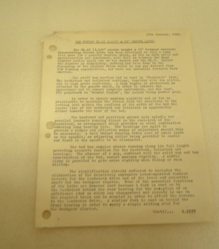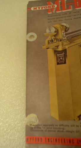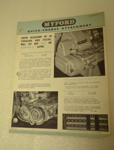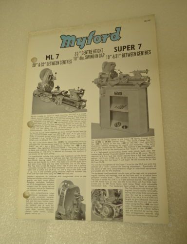 | Seller Notes | “*** This sale is for ONE GROUP of SEVEN previously owned COPIES (Original not photocopy) of: 1) Myford Ltd., MYFORD ML 8 Woodworking Lathe (8" Swing, 30 between Centers) on steel Cabinet Stand with 1541 Rear Turning Attachment. Leaflet No. 802 2) Myford Ltd., QUICK-CHANGE ATTACHMENT, Publication No. 711 3) Myford Ltd., HIGH SPEED SUPER SEVEN 3 1/2" CENTER LATHE 4) Myford Ltd., ML 7 (20" & 32" BETWEEn CENTERS), 3 1/2" CENTER HEIGHT, 10" dia. SWING IN GAP, SUPER 7 (19" & 31" BETWEEn CENTERS), Nr. 737 5) Myford Ltd., ML 8 WOODWORKING LATHE, SAW TABLE, DISC SANDER, Publication No. 800 6) Myford Ltd., SUPER 7, HIGH SPEED 3 1/2" CENTER LATHE, No. 747 7) The MYFORD ML 10 3 1/4" x 13" CENTER LATHE (1968, 2 pages)” |