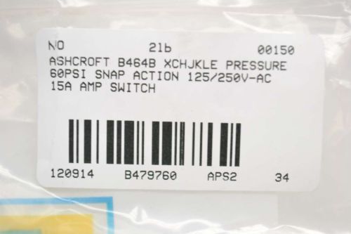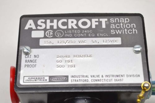 ASHCROFT B464B XCHJKLE PRESSURE 15PSI SNAP ACTION 250V-AC 15A AMP SWITCH B479761