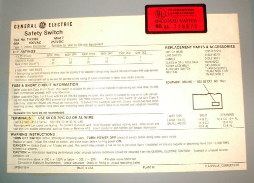 General Electric GE TGN3322 Heavy Duty Disconnect Switch 60A 240VAC NEMA 1