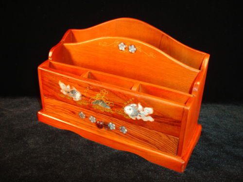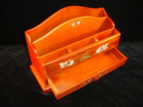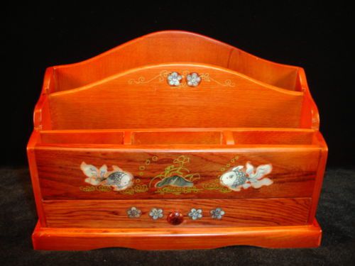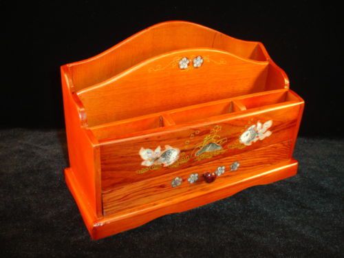 NEW Hand Carved Wood Art Mother Of Pearl Inlaid FLOWERS Desk Organizer
