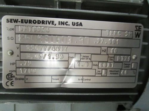 SEW EURODRIVE DF16DT80K4 0.75HP 460V-AC GEAR MOTOR D424972