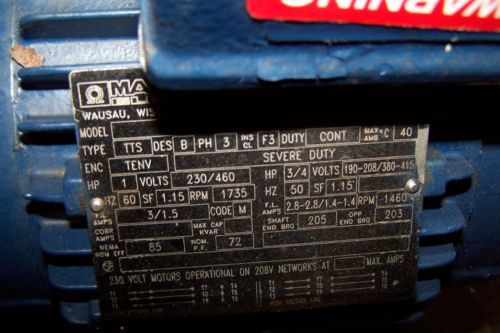 148375 Used, Marathon 3VK56T34D55278 Motor, 1/2 HP, 208-230/460V 3450 RPM