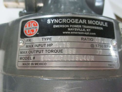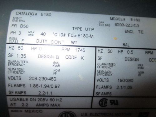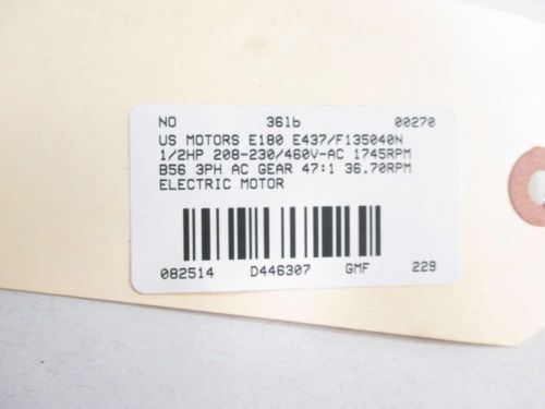 US ELECTRICAL MOTOR R465A FR 143TC HP 1.0 RPM 1735 V 208-230/460 USED GEAR BOX
