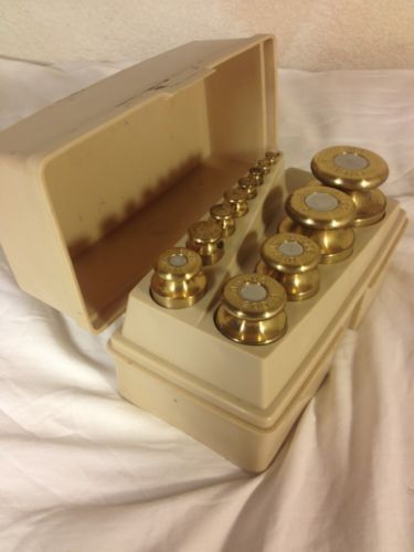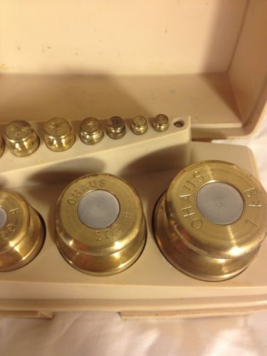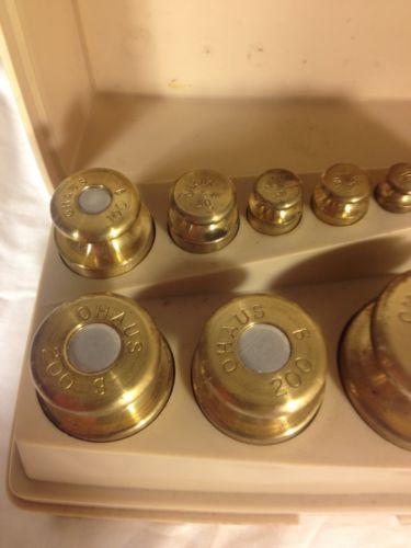 | “For sale is an OHAUS Sto A Weigh Brass Calibration Weights 13 Piece 1g-1000g With Case. This set only contains 12 pieces and is missing the 1 gram weight. Weight set is in good used condition, shows normal signs of use.” |