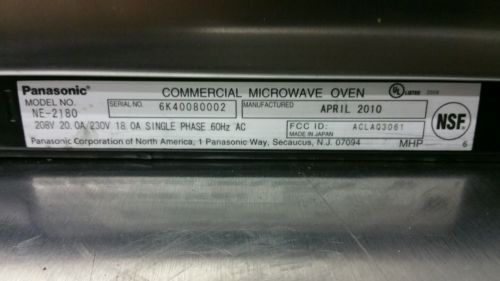 Panasonic NE-2180 Commercial 2100 Watt Microwave Oven w/ Sonic Steamer Absolutely BEAUTIFUL condition---this is liekly the nicest "used" condition microwave we have ever brought in-- please see pics! More DetailsKEY FEATURES Oven Capacity1.6 Cu. Ft. Table Pan CapacityTwo 4 in. tall, full size pans with covers Door StyleDrop Down Counter See-through Oven DoorYes Energy FeedYes (top & bottom) Programmable Memory Pads8 memory pads Memory Capability16 programs Magnetrons (Heating Elements)4 Chef Technical SupportYes Shift Key (AM-PM)Yes Programmable/Dial TimerYes Cooking Stages3-Stage Power Levels5 Levels Self DiagnosticsYes DisplayDigital Program ListYes Cycle CounterYes ShelfRemovable Center Shelf Tone ControlYes Cabinet FinishStainless Steel Cavity FinishStainless Steel Air FiltersYes Oven LightYes SPECIFICATIONS TimerHi-Med power: 15 mins Low, Defrost, Hold power: 60 mins Power Source208/230-240 V, 60Hz, Single phase Receptable Required30 Amp, NEMA 6-30R Frequency2450 MHz Required Power208V (20.0A), 230-240V (18.0A) Output2100W Cavity Dimensions (HxWxD)9 7/8 x 21 1/16 x 13 Dimensions (H x W x D)18 9/16'' x 25 9/16'' x 20 3/4'' Weight117 lbs About Us / Terms and Conditions: First and foremost, we would like to take the time to thank you for your interest-- we are a Central Florida based business specializing in both new and used commercial restaurant and bar equipment. We take great pride in providing excellent customer service and would like you to feel comfortable knowing you can buy from us with confidence! If you have any questions, PLEASE do not hesitate to contact us directly at 407-474-9934. We are generally available to be reached by phone from 8am-10pm, Monday-Friday (Eastern Time). Occasionally we will have someone available on weekends or after hours, but if you reach out to us during non-standard times, please allow us until the next business day and we will get back with you as soon as possible! Local Buyers are ALWAYS welcome (AND ENCOURAGED!) to view or test items in person prior to bidding or purchase! We are located in Sanford FL, 32771-- please call to schedule an appointment. We take a lot of items in on consignment-- any consignment items with a "best offer" option will need to be approved by our consignee and will be answered within 12 business hours. Please keep offers reasonable, offers of 1/2 of the asking price will be automatically declined. We describe items to the best of our ability-- we also try to include high-quality, detailed pictures showing any flaws we feel should be pointed out. We are only human and at times errors can be made-- serial numbers as well as model numbers are almost ALWAYS available. To avoid any potential mistakes, any technical questions should be directed to the items manufacturer PRIOR to purchase!!! PLEASE RESEARCH THE ITEM YOU ARE BUYING! Returns are not accepted based on "buyer's remorse", including errors regarding ordering incorrect items (wrong voltage, too big, too small, electric vs. gas, etc) PLEASE, ask before purchasing if you're not sure! We take great pride in providing quality items, and unless shown as being "UNTESTED" or of "UNKNOWN WORKING CONDITION", items have been tested by a technician and have proven to be in good working order. Unfortunately we may not always have the water/electrical capabilities, certain qualifications or additional equipment to test some items, and these will all be clearly listed as "untested". These items are being purchased with the buyers explicit understanding that the item is being sold "as-is, where-is, with no warranties or guarantees implied or expressed". We try to send our items out in good, clean condition but all used food service items should always be thoroughly cleaned prior to being put into service! Any items requiring ANY specialty installation (IE, anything that doesn't simply plug into a wall) MUST be installed by a licensed technician, electrician, etc in order to meet our warranty/return policy. Returns: As stated in all of our ads, we do not accept returns, however we also realize there is an exception to every rule. Returns (IF available) are ONLY accepted within 14 days of the purchase date and must be approved. We ask that you contact us with any concerns before beginning the return process to ensure that there is not a problem that can be resolved prior. Any and all items MUST be returned via the original carrier, and with all original packaging, paperwork, hardware, components, parts, etc. Items being returned for any reason other than being defective or damaged (changed mind/buyers remorse, didn't like, didn't research, ordered the wrong item, etc) will be subject to a 20% restocking fee and MUST be received in it's original condition, and via the same carrier with all parts, manuals, etc that came with the unit-- there are NO EXCEPTIONS to this! FALSE CHARGEBACKS ARE CONSIDERED FRAUD AND WILL BE TREATED AS SUCH BY OUR ATTORNEY! Buyer will be responsible for ANY AND ALL associated shipping costs, to and from SHIPPING: Items listed as "local pick-up only" that need to be shipped will only be done at BUYER'S expense. We are happy to help you with obtaining shipping quotes, and we do have a forklift available for loading, and will be happy to help palletize items to get them ready for shipment. A small palletization fee (for materials) may apply. IF YOU HAVE US HELP ARRANGE SHIPPING, AND GIVE FALSE/INCORRECT INFORMATION, YOU WILL BE RESPONSIBLE FOR ANY ADDITIONAL FREIGHT FEES! Please do NOT ask for business/ commercial pricing if it is going to a RESIDENCE! Freight shipping is non-refundable, under any circumstance. Important notice regarding REFRIGERATED Items: Due to varying shipping regulations, some refrigerated items MAY require the removal of refrigerant prior to shipping. On the same note, occasionally, due to the age of some units, and with the majority of our items being USED, the parts holding the refrigerant lines may become frail and come apart during th