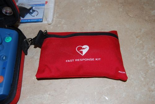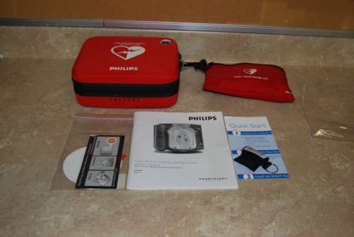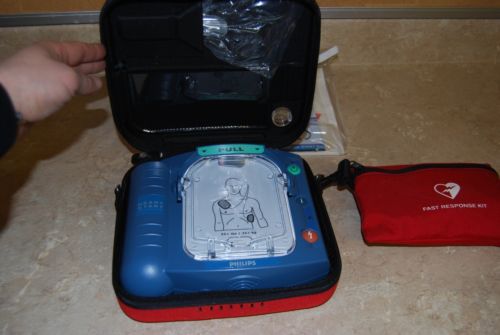 Philips HeartStart AED (warranty) with battery, pads, case and wall cabinet.