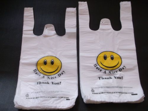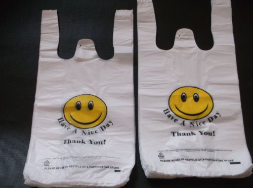 PLASTIC SHOPPING BAGS,T SHIRT TYPE GROCERY BAGS,HAPPY FACE WHITE 500 BIG BAGS.