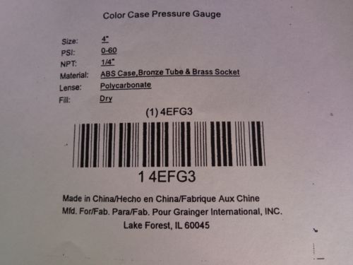 Pressure Gauge 4" Dia. 0 to 100 PSI 0 to 700 kPa 1/4NPT Grainger NIB
