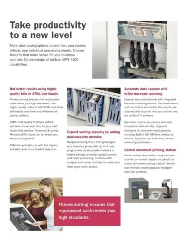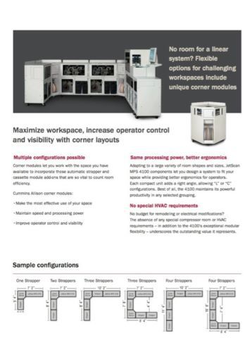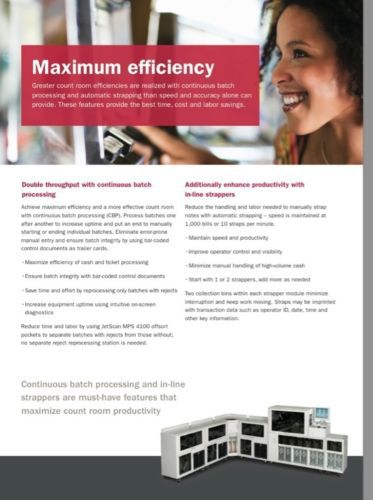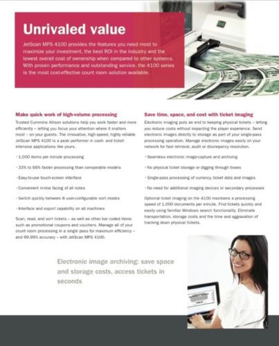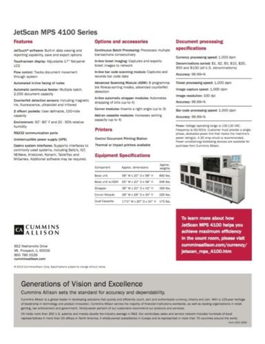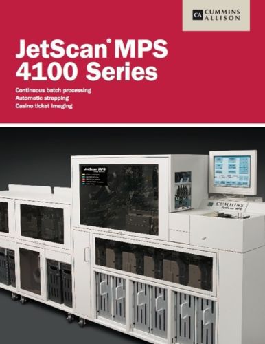 (Qty 1) Cummins Allison MPS 4115 Currency Counter/Sorter Buy here … and save over $200,000 dollars vs new!!! (Qty 1) Cummins Allison MPS 4115 Currency Counter/Sorter Buy here … and save over $170,000 dollars vs new!!! (Qty 1) Cummins Allison MPS 4115 Currency Counter/Sorter One fully-optioned unit ... Casinos, banks, trust co's, credit unions, cash logistics, cash services providers take note … here's an opportunity that will rarely … if ever … become available again! SAVE OVER $200,000 DOLLARS ON THE COST OF THIS EQUIPMENT TO THE ORIGINAL OWNER (Canadian Gov't) JUST 6 YEARS AGO. We are currently offering one Cummins Allison Jetscan 4115. We actually have (10) units in total that we are offering for sale … this eBay offering is for one unit. Alternatively please see our other eBay listings for (5) or all (10) units. Please review the attached photos and specifications. All the equipment was maintained for Canadian Government casinos by Cummins Allison directly.Prospective buyers are welcome to contract the local Cummins Allison office to attend and inspect this equipment on your behalf. We can assist you in that regard if you so choose - simply message us for that detail.This unit is at current s/w revision and has seen relatively modest use. As required by legislation in some jurisdictions, this unis offers full double-count functionality. It is in excellent operating condition.Our office will review all reasonable offers. Trusted Cummins Allison solutions help you work faster and more efficiently – letting you focus your attention where it matters most – on your guests. The innovative, high-speed, highly reliable JetScan MPS 4100 is a peak performer in cash- and ticket- intensive applications like yours. •1,000 items per minute processing •33% to 66% faster processing than comparable models •Easy-to-use touch-screen interface •Convenient in-line facing of all notes •Switch quickly between 8 user-configurable sort modes •Interface and export capability on all machines Scan, read, and sort tickets – as well as other bar coded items such as promotional coupons and vouchers. Manage all of your count room processing in a single pass for maximum efficiency – and 99.99% accuracy – with JetScan MPS 4100. Save time, space, and cost with ticket imaging Electronic imaging puts an end to keeping physical tickets – letting you reduce costs without impacting the player experience. Send electronic images directly to storage as part of your single-pass processing operation. Manage electronic images easily on your network for fast retrieval, audit or discrepancy resolution. •Seamless electronic image-capture and archiving •No physical ticket storage or digging through boxes •Single-pass processing of currency, ticket data and images •No need for additional imaging devices or secondary processes Optional ticket imaging on the 4100 maintains a processing speed of 1,000 documents per minute. Find tickets quickly and easily using familiar Windows search functionality. Eliminate transportation, storage costs and the time and aggravation of tracking down physical tickets. Double throughput with continuous batch processing Achieve maximum efficiency and a more effective count room with continuous batch processing (CBP). Process batches one after another to increase uptime and put an end to manually starting or ending individual batches. Eliminate error-prone manual entry and ensure batch integrity by using bar-coded control documents as trailer cards. •Maximize efficiency of cash and ticket processing •Ensure batch integrity with bar-coded control documents •Save time and effort by reprocessing only batches with rejects •Increase equipment uptime using intuitive on-screen diagnostics Reduce time and labor by using JetScan MPS 4100 offsort pockets to separate batches with rejects from those without; no separate reject reprocessing station is needed. Additionally enhance productivity with in-line strappers - NOTE: THE UNITS WE ARE OFFERING HAVE THE STRAPPING AND PRINTING OPTIONS! Reduce the handling and labor needed to manually strap notes with automatic strapping – speed is maintained at 1,000 bills or 10 straps per minute. •Maintain speed and productivity •Improve operator control and visibility •Minimize manual handling of high-volume cash •Start with 1 or 2 strappers, add more as needed Two collection bins within each strapper module minimize interruption and keep work moving. Straps may be imprinted with transaction data such as operator ID, date, time and other key information. Take productivity to a new level More labor saving options ensure that your system reflects your individual processing needs. Choose features that make sense for your business – and take full advantage of JetScan MPS 4100 capabilities. Net better results using higher quality bills in ATMs and kiosks Fitness sorting ensures that repurposed cash meets your high standards. Use higher quality notes to refill ATMs and other self-service machines and wherever bill quality matters. Better note quality improves uptime and reduces service calls for your cash dispensing devices. Advanced Scanning Module (ASM) allows you to select your fitness sorting level. ASM also provides you with the highest available level of counterfeit detection. Expand sorting capacity by adding dual cassette modules Keep processing times from growing as your business grows. Add up to 4 user- programmed dual-cassette modules to extend periods of uninterrupted currency and ticket processing. Combine with strapper and corner modules to create your ideal count room system. Automate data capture with in-line bar-code scanning Capture data automatically with integrated bar-code scanning module. Bar-coded items such as tickets and control documents are scanned and exported into your system via our JetTouchTM software. Bar-coded control documents eliminate error-prone manual entry. Supports interfaces to common