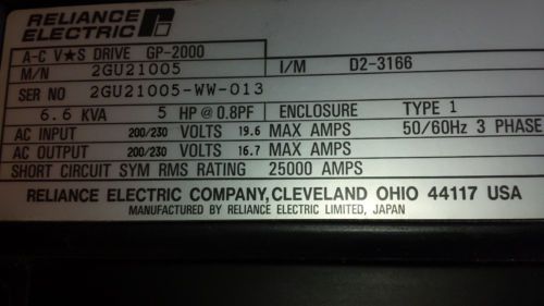 “Reliance Electric A-C VS Drive GP-2000 Model: 2GU21005 I/M: D2-3166 S/N: 2GU21005-WW-013 6.6kva, 5HP @ 0.8PF, Enclo. 1 In: 200/230V 19.6A 50/60Hz 3Ph Out: 200/230V 16.7A Short Circuit Sym RMS Rating 25,000A” |