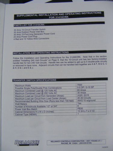 BRAND NEW Reliance 6 Circuit Transfer Switch Kit with Power Cord