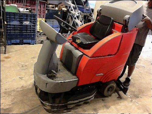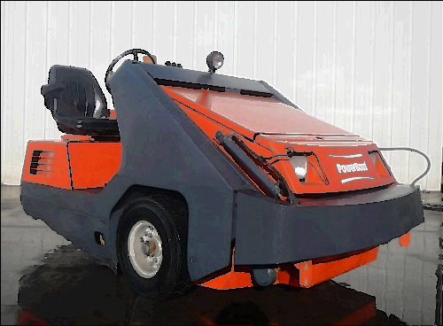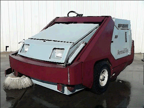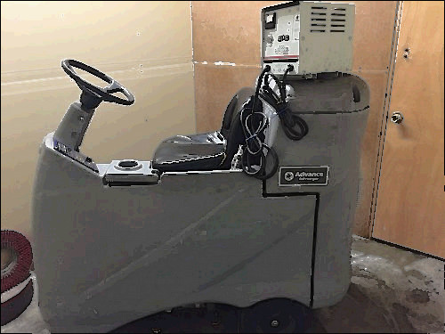Alto American Lincoln SC7730 battery powered sweeper scrubber. It comes complete and ready to go to work with decent batteries, good squeegee rubber, good disk scrubbing brushes, and a good cylindrical sweeping broom and dust filter. The 7760 is an industrial floor cleaning machine capable of one-pass cleaning of large floor areas.