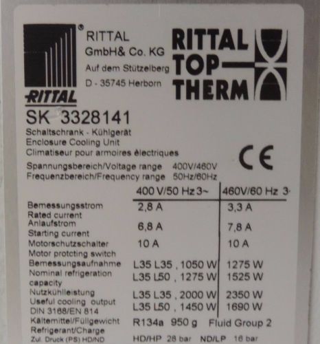 RITTAL SK-3328140 TOP THERM ENCLOSURE COOLING UNIT 400-460V 50/60HZ 2.8-10AMP
