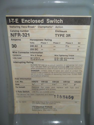 ITE SIEMENS V7E3611 VACU-BREAK 30 AMP 600V FUSED PANELBOARD SWITCH