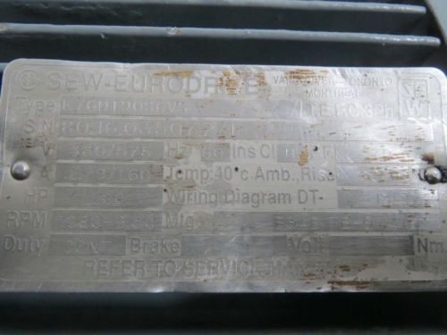 SEW EURODRIVE W30DT80K2 GEAR 0.88KW 266/460V 3230/315RPM ELECTRIC MOTOR B365200