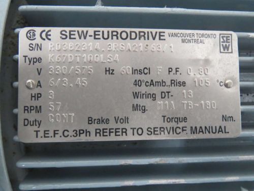 SEW EURODRIVE KA46 10.48:1 GEAR 3HP 575V-AC 1720/164RPM ELECTRIC MOTOR B367453
