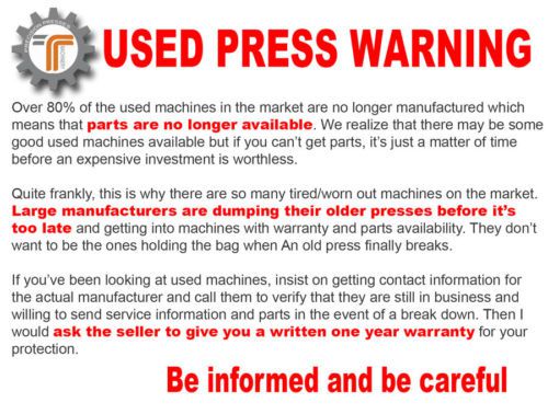 CJR is a leading distributor of commercial cutting presses. We offer presses from 10 ton swing arm clicker presses to 75 ton CNC traveling head presses. We ship world wide. * NEW 25 Ton Swing Arm Clicker Press * Maximum cutting force 250kN * Width of the swing arm 17.5" x 19.5" * Stroke Adjustment 1/4" - 3" * Cutting Speed 0.10m/s * Area between arm & bench 2.5" - 6" * Base table is 39" wide by 19" deep * Weight 2200 lbs dry * Motor Power 1.5 kw * Oil Tank 15 Gallon ( machine is shipped dry) * Power Requirement 3P 220V, 60Hz (more information below) * Shipping We ship world wide ( See deatils below) * Replacement Parts Next day shipping * Warranty 1 Year * Owners Manual included Yes (pdf) * Service Tech Call 909 256 6699 SPECIAL OFFER We have this machine in stock, but if buyer wants to order a new machine that is not currently in stock we are able to discount the price by 400.00. The delivery time for non-stock machines is 45 to 60 days to our California Center. Call us for more information about ordering a non-stock machines. TRADE IN GUARANTEE Seller will credit 90% of the purchase price towards a bigger machine if traded in the first year. PRODUCT TESTING Call us to arrange any product cutting tests. If you send us samples of the material you will be cutting along with a die, we will perform tests with different machines and tonage to determine the best machine for your application. We will video the tests and make available to you by youtube. There is no charge for product testing but Buyer is responsible for paying shipping both ways. WIRING Power requirement is 3P220V, 60Hz Buyer must use licensed electrician to wire this machine Mistakes in wiring will permanently damage this machine and are not covered by warranty PAYMENT Seller accepts payment by PayPal, check or money order. If paying by check or money order, we will need confirmation by our bank that funds have cleared before the press will be released for shipping For additional information call 909 256 6699 Ask for James or Chris We offer NEW presses from 10 ton to 75 ton. We have beam presses, traveling head presses, CNC traveling head presses and swing arm presses. We can custom build for any application. WARNING - Be careful about buying older presses because the seals and hydraulic pump get bad over time resulting in less down pressure. If you buy a used press insist on a warranty of think twice. Hydraulic ram replacement can cost as much as a new machine with labor. TRANSACTION DETAILS We try to be fair and accurate with all descriptions. Please read descriptions and policies carefully before purchase. CORRECT INFORMATION We give you the information that is supplied by our vendors. If this information is incorrect, please contact us through eBay before leaving negative feedback. RETURNS & REFUNDS If buyer is not satisfied with the quality of this item or chooses to return the item for any reason, Seller agrees to offer a full refund for the purchase price of the item less any restocking fee if applicable. Seller does not offer refunds for original shipping or return shipping. Notice of intent to return an item must be made within 3 working days of delivery. Buyer must notify seller through eBay prior to returning any item in an effort to alert customer service to be looking for the delivery. Deliveries are received between 11am and 3pm Monday - Friday. A handling /restocking fee of 10% of the purchase price will be charged for return items on this item. SHIPPING Shipping must be arranged by the buyer. This item weighs 2200 lbs dry. The item will be shrink wrapped and secured to a open pallet which is 4' x 5'. Total height will be 65" In the event the buyer chooses to return this item for any reason they should purchase shipping insurance as they will be responsible for any damage which occurs during shipping. Seller will photograph all sides of the press prior to loading Seller does not have a loading dock but does have a fork lift to load the pallet. Seller's shipping department will receive trucks between 11am and 3pm Monday - Friday except for holidays. Buyer is responsible to provide seller a legible fax or pdf copy of their trucking companies BILL OF LADING Buyer must give Seller 24 hours notice before their trucking company arrives for pickup. DAMAGED ITEMS Items damaged during shipping are the responsibility of the buyer and their trucking company. The press is fully photographed at the time of shipment. RETURN SHIPPING Please include a copy of the eBay/PayPal transaction in the return box. Always send returns from the same address and contact that was used when you received the package. We require that buyer sends return packages with a required signature to verify receipt by seller. In most cases Seller can issue a refund the same day that a returned item is received however buyer is required to allow up to 3 working days for seller to verify returned contents before issuing a refund. CORRESPONDENCE We always try to respond to buyer correspondence same day but we request that buyer allows up to 48 work hours for seller response to enquiries concerning a transaction. WORK HOURS Working hours are from Monday to Friday 9 to 5 Pacific time CONTACT: