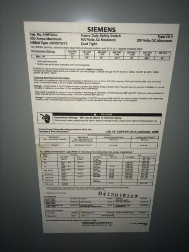 SIEMENS DISCONNECT TYPE 1 HF365 400AMP 600VOLT 3POLE FUSIBLE INCLUDES FUSES