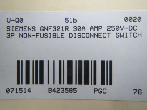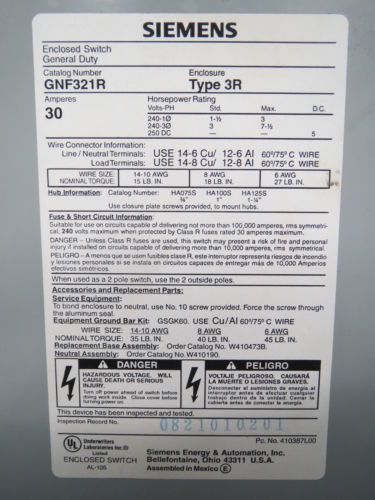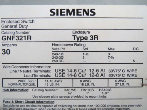 Siemens GNF322R General Duty Safety Switch Nema Type 3R 60 Amps 250 Volts max.