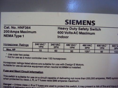SIEMENS HF364N - 200A 3P 600V 4W FUSED HEAVY DUTY TYPE 1