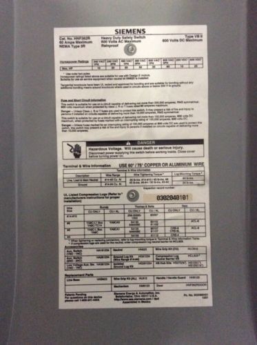Siemens Heavy Duty Safety Switch 60 Amp 600 Volt HF362R Fusible 3R