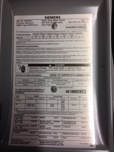SIEMENS HF321NR FUSIABLE NEMA 3R 30 AMP HEAVY DUTY SAFETY DISCONNECT SWITCH NEW