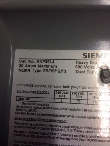 SIEMENS HEAVY DUTY SAFTY SWITCH HF361 30 A 600 VAC 250VDC