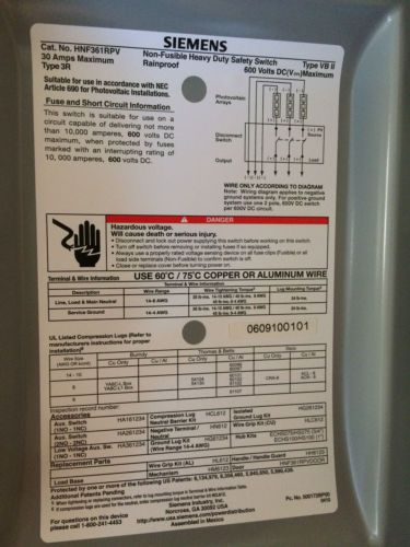 | Seller Notes | “New in box, surplus, never installed or connected. 30A 3 pole 600VDC max. raintight (NEMA 3R) non-fused disconnect switch, specially designed for use in PV systems up to 600VDC on all 3 poles (UL1741).” |