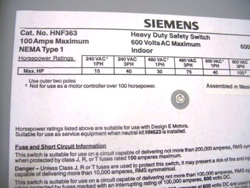 Siemens Heavy Duty Safety Switch, HNF364; VBII 150HP 3P 3PH 600V 200A NEMA 1 HNF