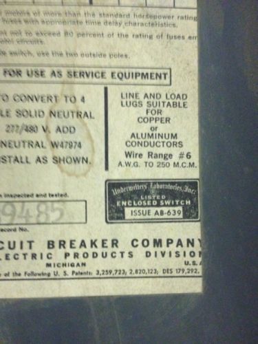 GOULD ITE SAFETY SWITCH 3 PHASE 240 V 100 AMP SN423
