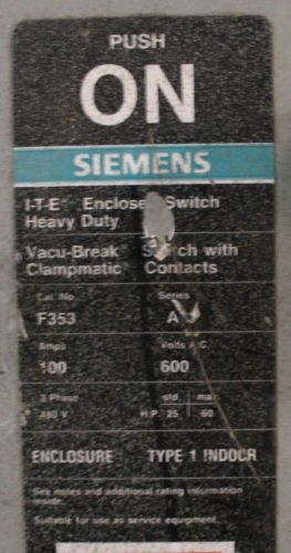 Siemens ITE enclosed disconnect safety switch 100amp 600volt #F353 WILL SHIP
