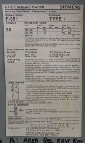 Siemens ITE fusible enclosed Vacu Break safety switch 60 amp 240 volt FREE SHIP