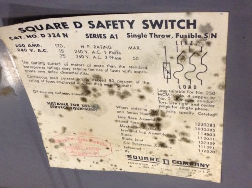 Square D 200 Amp Fusible Disconnect Switch 50 HP 240 VAC D324N 150 Amp Fuses