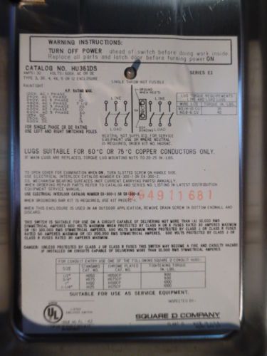 SQUARE D HU362 SERIES F3 60 AMP HEAVY DUTY SAFETY SWITCH