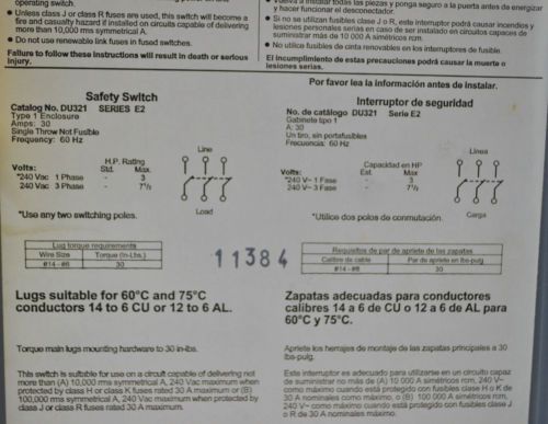Square D DU321 30A240VAC Series E2 General Duty Safety Switch
