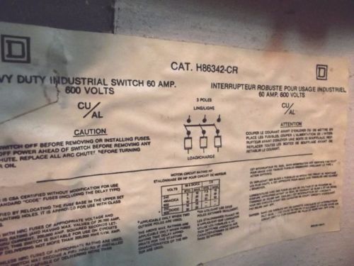1 NIB SQUARE D H-362-DS H362DS 60 AMP 600 VAC STAINLESS STEEL SAFETY SWITCH
