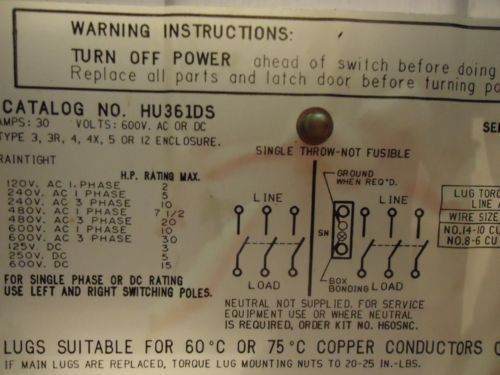 Square D Stainless Steel Heavy Duty 30A 600V Safety Switch Cat# HU361DS .. VR-13