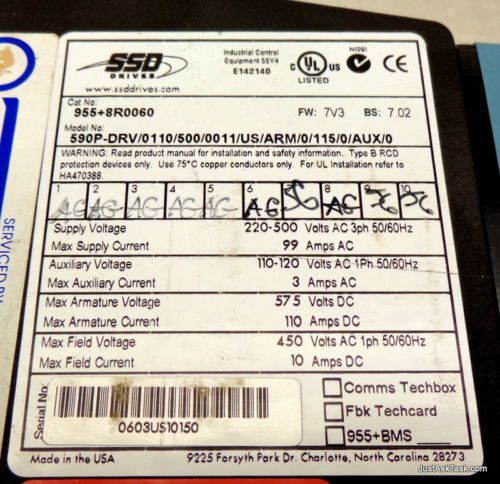 Eurotherm/Parker DC Drive 955+8N0020, 591P-DRV/0035/500/0011/US/ARM/O/AUX/O