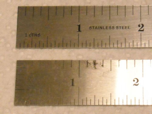 I have a huge selection of rules in numerous graduations, finishes and lengths. Click on the links below to see my selection: 4R (1/64" & 1/32" on one side and 1/16" & 1/8" on reverse) 5R (1/32" & 1/64" on one side and 1/10" & 1/100" on reverse) 16R (1/32", 1/64" one side, 1/50" & 1/100" reverse) English/Metric (1/32" & 1/64" on one side and ,5mm & mm on reverse) Metric (.5mm and mm both sides) Up for fixed price are 6" rules which are almost exact duplicates of much more expensive US made precision 6” rules. These rules are made from hardened stainless steel with ground edges, have a satin finish and are 3/4 ” wide by .032” thick. The scales are deeply and precision etched and black filled for long life and easy readability and graduated with 1/32" and 1/64" one side and mm and .5mm on the other side. They have end graduations on both ends in 1/32nds of an inch. They are US engineered and then made to strict US standards in precision tool factories overseas. Picture #1 & 2 are the front and back of a rule for fixed price (remember only one is up for sale). Pictures #3 and on include both rules (the duplicate and a much more expensive rule) for comparison. The more expensive rule is always below the duplicate. As you can see, there is little difference between both rules. REMEMEBR: the more expensive US rule is NOT included in this sale and is included in the later pics for comparison purposes only!! I have used both rules extensively in my shop and have found the one up for sale to function every bit as well as the more expensive US rule. I have sold hundreds of these rules on Ebay and have never received a negative comment. The duplicate offers several advantages: 1) they are made from tempered stainless steel and the other is hardened steel, thus the duplicate will never rust. You will notice a patch of rust forming on the more expensive premium US rule in picture #4. (Bummer, as this rule is less than 6 months old. 2) the duplicate is pennies on the dollar compared to a new one of the other. (Other retails for around $20.00 on Amazon). Rules come in a vinyl pouch. 1st rule ships for 2.00 (this covers 1st class shipping and tracking) and all subsequent rules ship for an additional .25 each. You will not be disappointed in the rule. Rules ship 1st class. Thanks for looking!! ---------------------------------------------------------------------------------------------------------------------------------------------------------------------------------------------- My E-Bay philosophy is simple, you are the customer and you decide how you want to handle the deal. I will go along with most anything as long as it is not too outrageous and you keep me informed. If it will be a few days before you get payment to me, no problem, just let me know so I will not worry about it being lost. I do not have any hard and fast time lines on what happens when. I work very hard to get all packages to the Post Office the next day after I receive payment. If for some reason that will be delayed, I will let you know. All my items are shipped for free either USPS 1st class or Priority shipping. I will ship another method to get it to you faster as long as you and are willing to pay for the faster shipping. I’m sorry, but I must charge 7.35% state sales tax for all Missouri orders. You decide how you want to pay and I will usually go along with it. So far all (well, most) of my dealings have been with nice, honest people. (As I would expect) . I do ship worldwide. Please use the shipping calculator to determine shipping to your location. I ship all items 1st class international, which can sometimes take 30 days to arrive. Import duties, taxes and charges are not included in the item price or shipping charges. These charges are the buyer's responsibility. Please check with your country's customs office to determine what these additional costs will be prior to buying. My satisfaction policy is also very simple, you are the customer and you decide if you want the item. Satisfaction is guaranteed, no exceptions. Purchase may be returned for any reason or no reason within 30 days in original condition for a full refund. If the item is defective or for something I did or failed to do, I will also refund the postage. If you just changed your mind or found another one down the street, cheaper or better. I still accept returns except you will need to pay the postage.