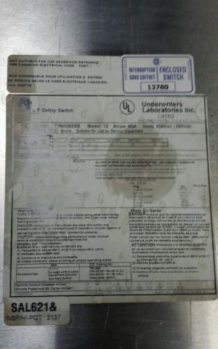 GE DISCONNECT TYPE 1,5,12 THN3363J 100AMP 600VOLT 3POLE NON-FUSIBLE