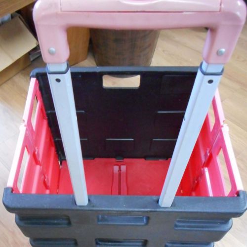 | “this is a great pre owned rolling cart on wheels that collaspes for easy storage..Handle goes up/downgreat condition..hard plastic” |